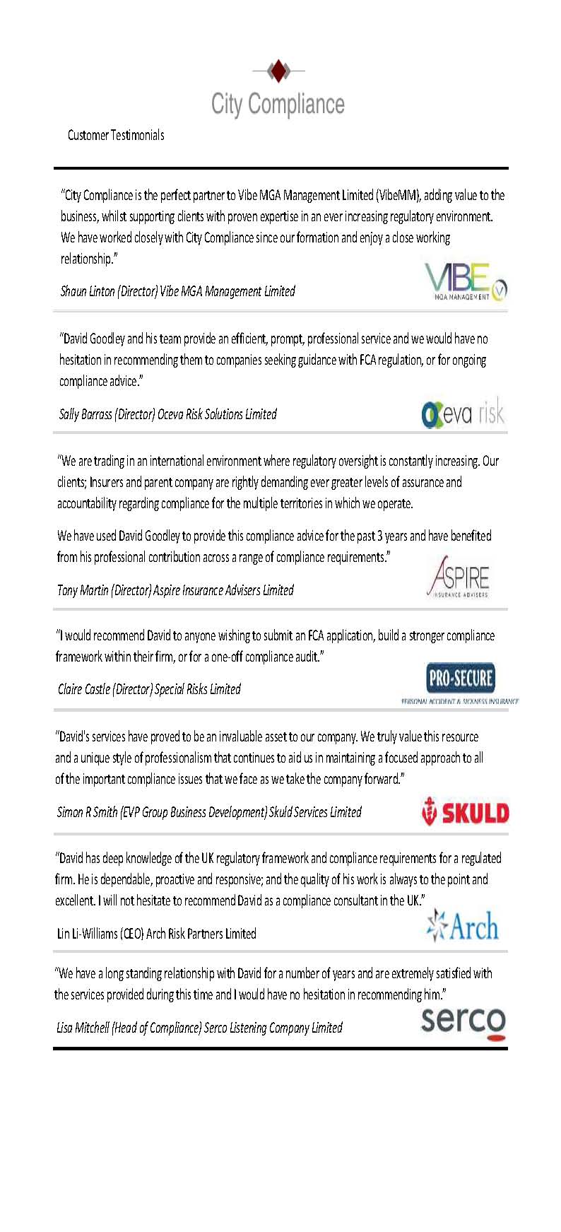 We are trading in an international environment where regulatory oversight is constantly increasing. Our clients,Insurers and parent company are rightly demanding ever greater levels of assurance and accountability regarding compliance for the multiple territories in which we operate.We have used David Goodley to provide this compliance advice for the past 3 years and have benefitted from his professional contribution across a range of compliance requirements.![]()